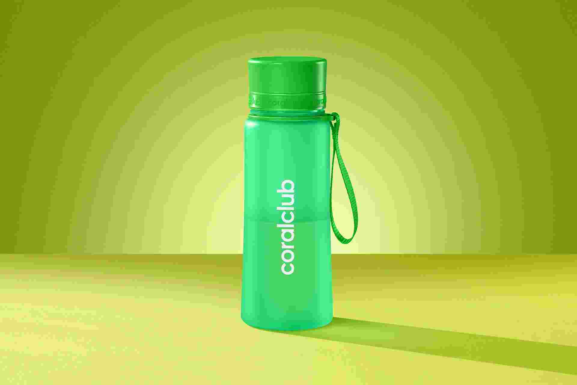 Міцна, екологічна та легка пляшка Coral Club чудово підійде для поїздок, прогулянок або занять спортом.